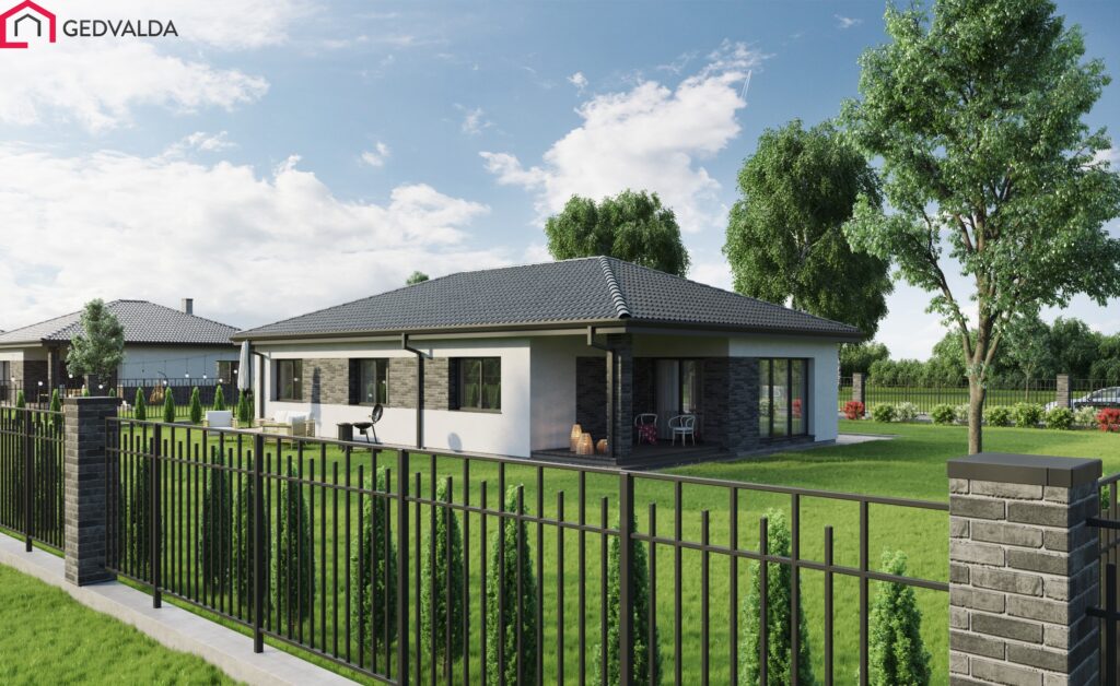 Klasikinio dizaino, vieno aukšto, gyvenamasis namas. Pastatas puikiai tinka jaunos šeimos poreikiams. Gyvenamajame name suprojektuoti trys miegamieji kambariai ir erdvi svetainė. Prie svetainės – virtuvės įrengiama terasa su stogu virš jos. Name numatyta viena bendra vonia.