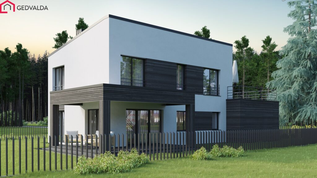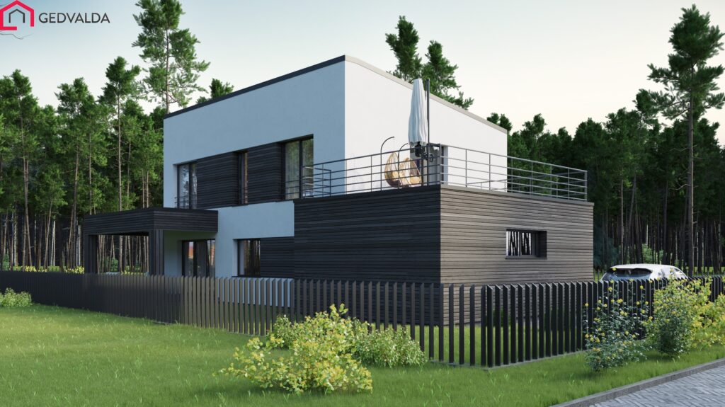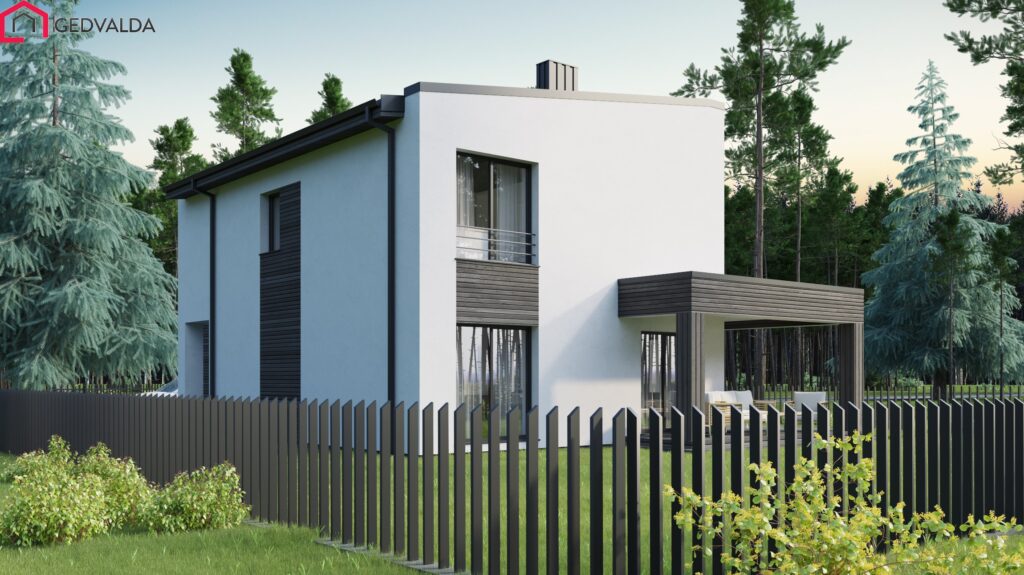 Modernaus dizaino dviejų aukštų gyvenamasis namas. Namo antrajame aukšte suprojektuoti trys miegamieji kambariai. Suaugusiųjų miegamasis turi privačią drabužinę ir vonios kambarį. Numatytas atskiras tualeto – vonios kambarys. Gyvenamajame name suprojektuotas erdvus balkonas, į kurį galima patekti iš suaugusiųjų miegamojo kambario. Pirmajame aukšte numatyta pagalbinė patalpa. Suprojektuota erdvi svetainės- virtuvės patalpa. Numatytas tualeto kambarys. Įrengiama terasa po stogu, į kurią patenkama iš svetinės – virtuvės patalpos. Gyvenamasis namas turi garažą, kuris skirtas vienam automobiliui.