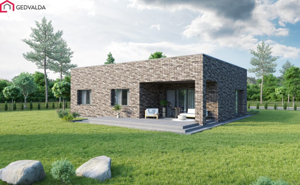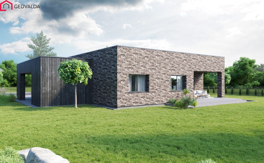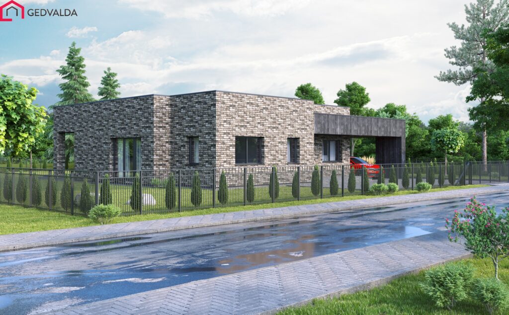 Modernaus dizaino vieno aukšto gyvenamasis namas. Gyvenamajame name suprojektuoti trys miegamieji kambariai. Suaugusiųjų miegamasis turi privačią drabužinę. Taip pat įrengiami du atskiri tualeto ir vonios kambariai. Numatyta pagalbinė patalpa. Name suprojektuota erdvi svetainės- virtuvės patalpa. Kiemo zonoje įrengiama terasa, į kurią patenkama iš svetainės- virtuvės patalpos. Suprojektuota stoginė automobiliui ir lauko sandėlis.