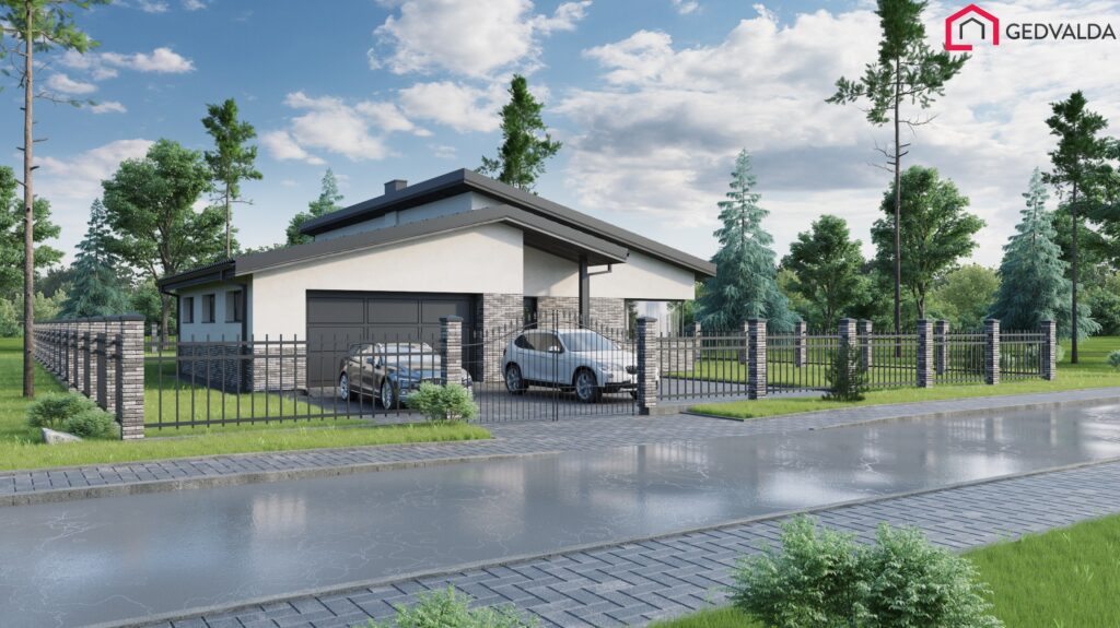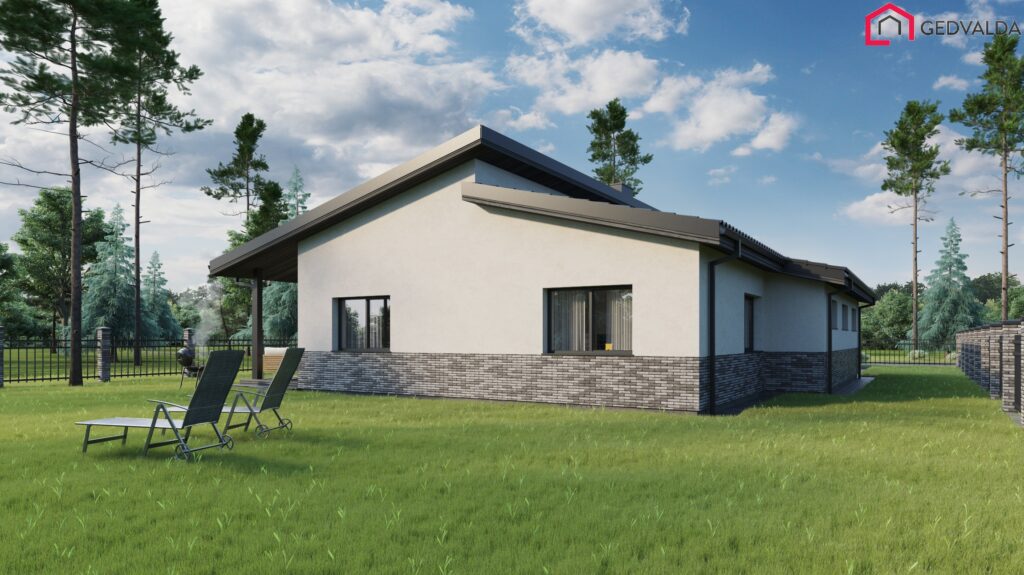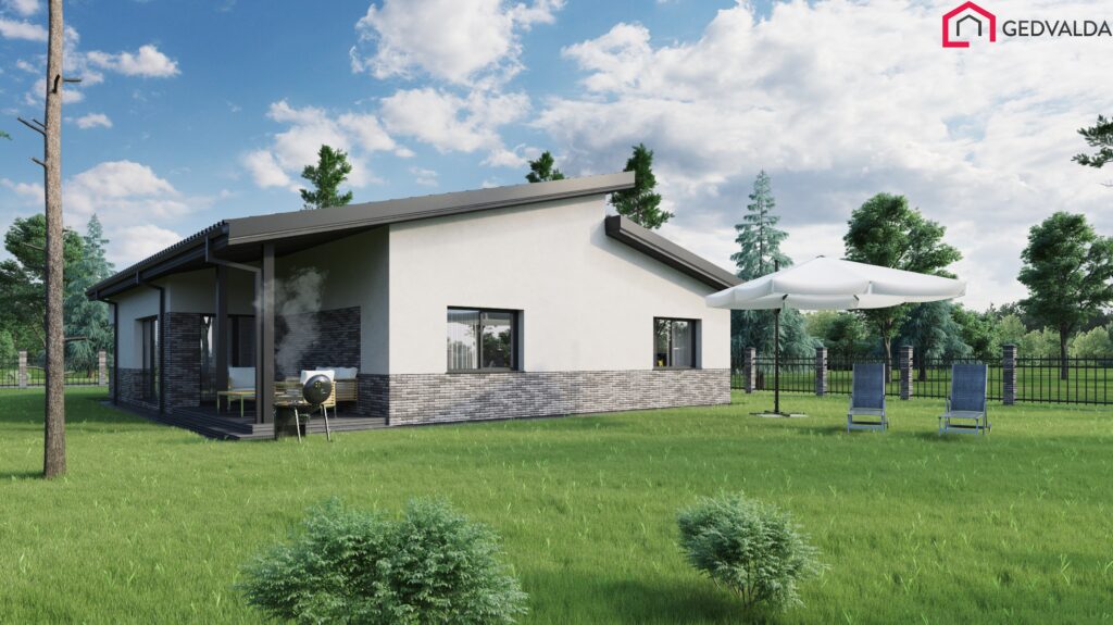 Modernaus dizaino, vieno aukšto, gyvenamasis namas. Pastatas puikiai tinka jaunos šeimos poreikiams. Gyvenamajame name suprojektuoti trys miegamieji kambariai ir erdvi svetainė. Prie svetainės – virtuvės įrengiama terasa. Name numatyta viena bendra vonia. Tai pat name suprojektuotas garažas, kuris skirtas dviem automobiliams.