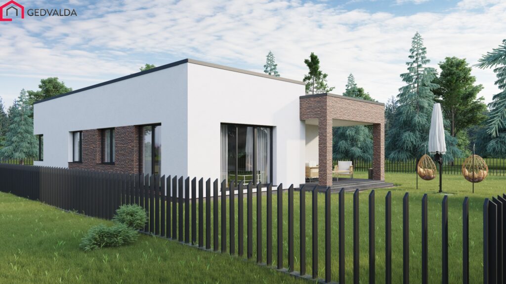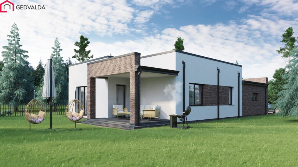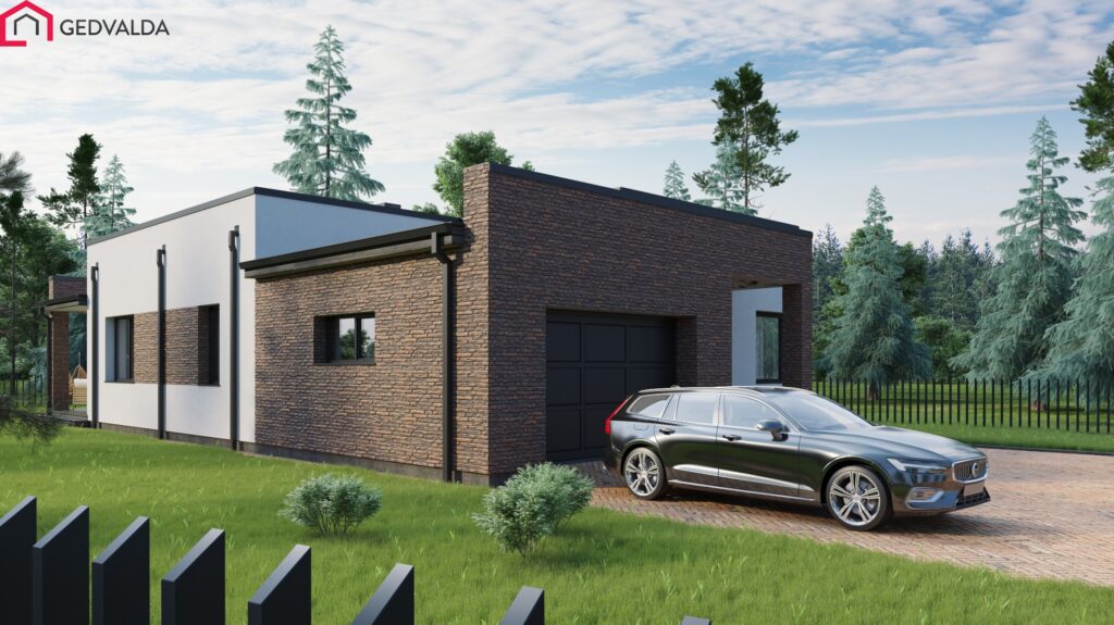 Modernaus dizaino, vieno aukšto, gyvenamasis namas. Gyvenamasis namas turi garažą. Name suprojektuoti trys miegamieji kambariai. Pagrindinis miegamasis turi privačią drabužinę. Namuose suprojektuotas bendras tualetas – vonia. Name suprojektuota erdvi svetainės- virtuvės patalpa. Kiemo zonoje įrengiama terasa, į kurią patenkama iš svetainės- virtuvės patalpos.